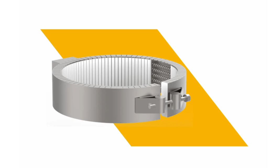 Mica band heaters offer efficient and economical solutions for heating cylindrical surfaces that require external indirect heating. They are an ideal solution for high-watt-density and high-temperature applications. It uses a nickel chromium resistance strip as a heating element, which is precisely wound on a dielectric material for even heat distribution. The heating element is insulated within a mica core enclosed in a metal sheath, which provides exceptional insulation, dielectric strength, and heat transfer capability for faster heat-up and longer heater life.